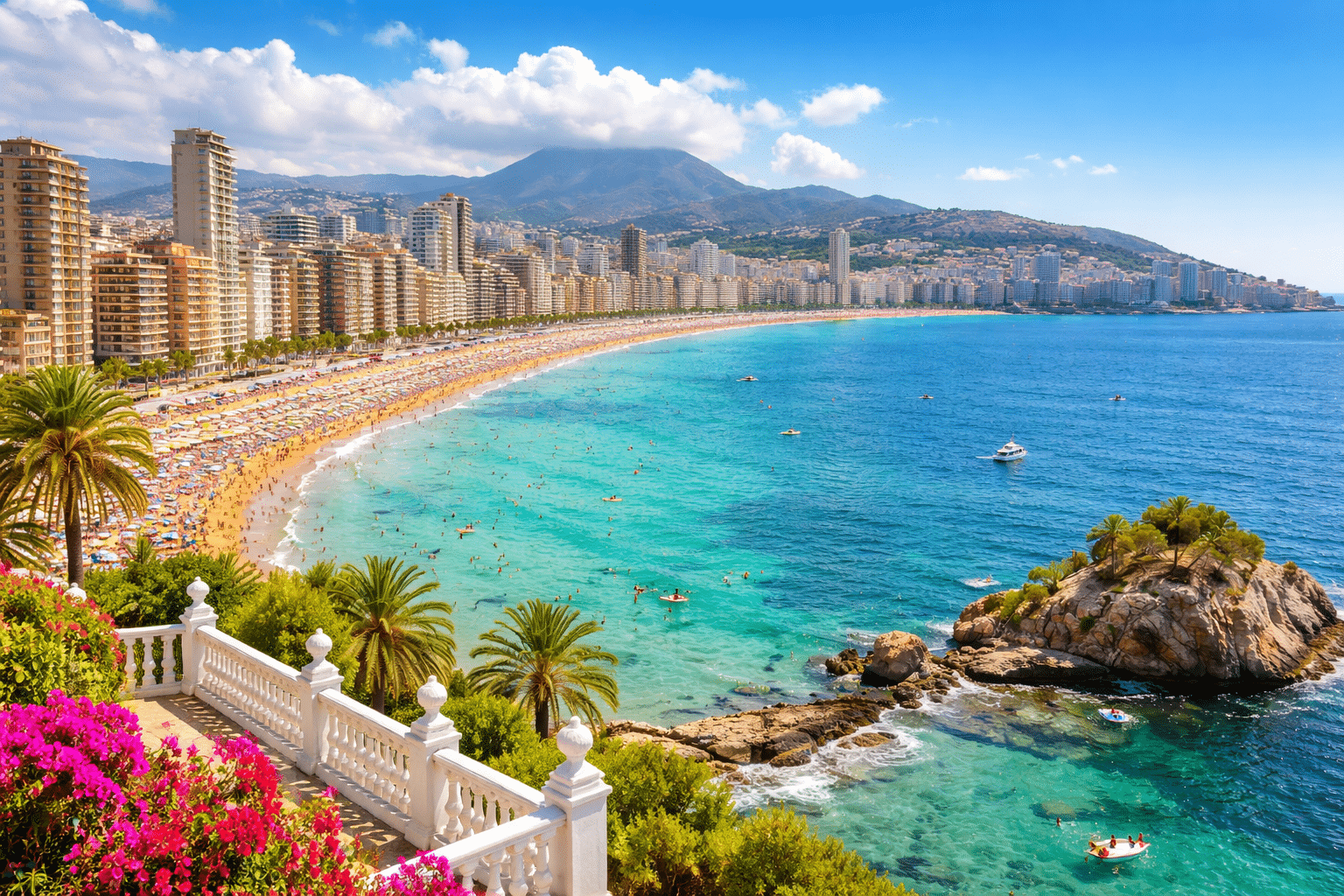 🌍 Benidorm se situe sur la Costa Blanca, à deux pas d’Alicante, et s’est construite une réputation unique entre mer, gratte-ciel et soleil quasi permanent.